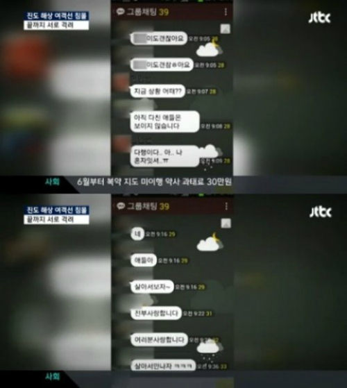 교사는 학생들에게 "괜찮니?"라고 안부를 물었고 이에 학생들은 각자의 생사 여부를 전했다. 이어 배가 기울어져가는 상황인 9시20분에는 "얘들아 살아서 보자" "전부 사랑합니다"라며 끝까지 서로를 격려하는 모습을 보였다.