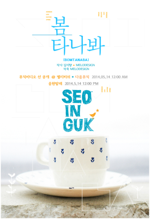 공개된 이미지 속에는 달달함이 느껴지는 커피잔을 배경으로 오는 14일 전격 공개될 서인국의 새 디지털 싱글 곡명인 ‘봄 타나봐(BOMTANABA)’가 적혀있다. 이 곡은 봄과 어울리는 따뜻하면서도 청량감이 듬뿍 뭍어 나는 감성 어반 미디어 곡이다.