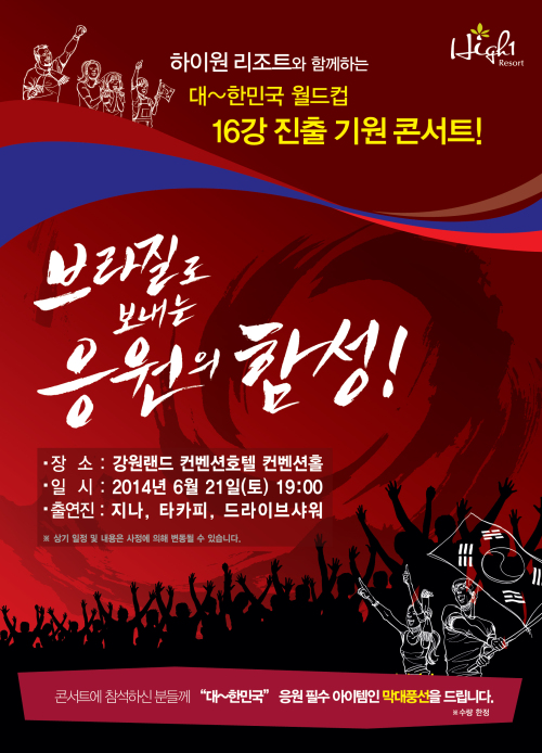 또한 역대 대한민국 경기 하이라이트 상영 및 퀴즈를 통해 상품권 등 다양한 경품도 즉석에서 지급한다. 이밖에도 하이원 골프장에서는 대한민국 예선경기가 있는 23일, 27일 마운틴 6번홀(파3)에서 2명 이상 온그린에 성공한 팀에게는 맥주 4캔을 증정하는 이벤트도 함께 진행한다. 자세한 내용은 홈페이지(www.high1.com) 참조.