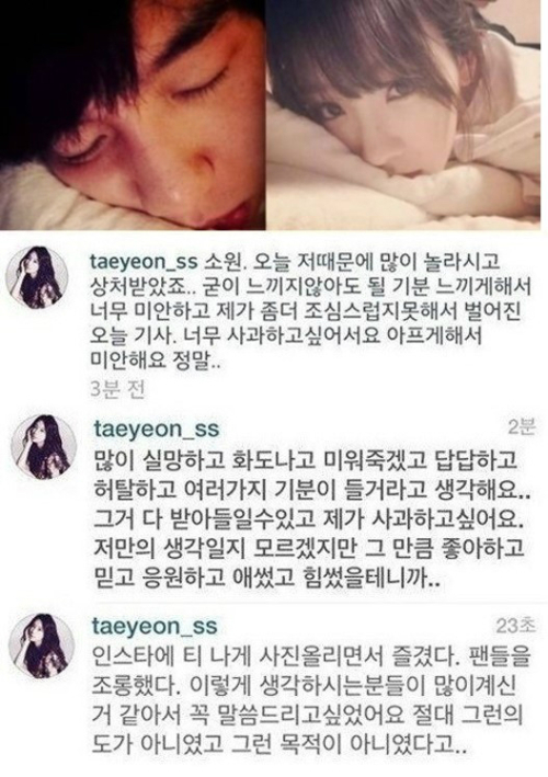 이에 이날 오후 태연은 자신의 인스타그램을 통해 "소원. 오늘 저 때문에 많이 놀라시고 상처받았죠. 굳이 느끼지 않아도 될 기분 느끼게 해서 너무 미안하고 제가 좀 더 조심스럽지 못해서 벌어진 오늘 기사. 너무 사과하고 싶어서요. 아프게 해서 미안해요. 정말"라며 글을 시작했다.