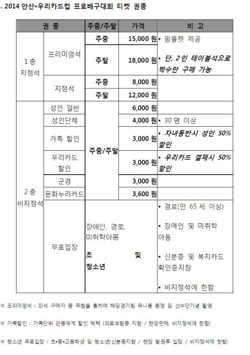 가족단위의 스포츠관람을 장려하기 위해 자녀를 동반한 부모에게는 비지정석에 한해 50% 할인 혜택을 부여하고, 우리카드로 결제한 고객에 대해서도 동일한 혜택을 준다.