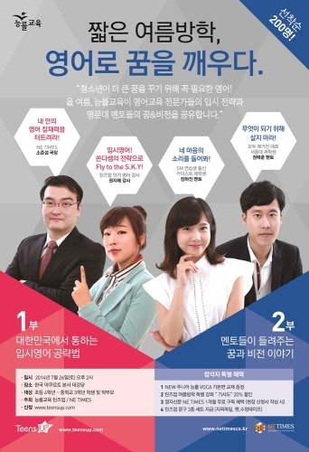 ‘짧은 여름방학, 영어로 꿈을 깨우다’라는 주제로 열리는 이번 강연회는 초등학교 4학년~중학교 3학년 학생 및 학부모를 대상으로 하며, 영어교육 전문가들의 영어학습 비법을 비롯해 명문대생 학습 멘토가 들려주는 꿈과 진로 선택에 대한 조언으로 꾸며진다.