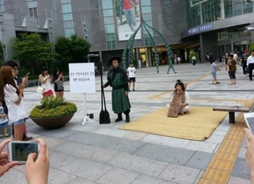 사진 속에서 박명수는 서울 영등포 타임스퀘어 광장에서 흰 소복을 입고 목에 칼을 찬 채 시민들로부터 곤장을 맞을 준비를 하고 있다. 옆에는 '성난 시청자분들의 곤장을 달게 맞겠습니다'라는 글귀가 적혀 있어 누리꾼들의 웃음을 자아내고 있다.