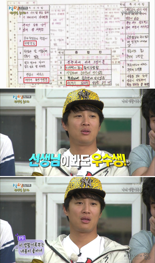 이날 멤버들은 야식을 가지고 깜짝 방문한 걸그룹 씨스타와 함께 ‘1박 2일’ 멤버들의 초등학교 시절 생활기록부를 활용한 퀴즈를 진행했다. 이때 차태현의 생활기록부가 공개됨과 동시에 모두의 감탄을 자아내 눈길을 끌었다.