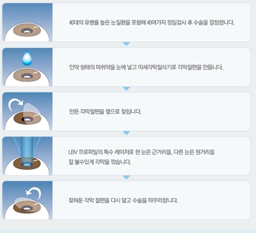 LBV 라식수술 과정은 간단하다. 우선 수술 결정 여부는 40대의 유병률이 높은 눈 질환을 포함해 40여 가지 정밀검사를 시행한 후 판단한다. 수술은 먼저 안약 형태의 마취약을 눈에 넣고 미세각막절삭기로 각막 절편을 만든다. 각막 절편을 옆으로 젖힌 후 LBV 프로파일의 특수 레이저로 한 눈은 근거리를, 다른 눈은 원거리를 잘 볼 수 있게 각막을 깎아낸 후 젖혀둔 각막 절편을 다시 덮으면 모든 수술이 끝난다.