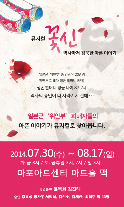 두 번째로, 일본군 ''위안부'' 피해 사실을 다룬 한국 최초의 뮤지컬 ‘꽃신’의 조용한 약진이 귀추를 주목 시키고 있다. 뮤지컬 ‘꽃신’은 지난 6월에 개최된 2014년 대구국제뮤지컬페스티벌 어워즈 에서 창작 뮤지컬상 수상과 여우 조연상(윤복희)을 수상하며 2014년 상반기 최고의 창작 뮤지컬로 이목을 집중시키며 기대를 모은 작품이다.