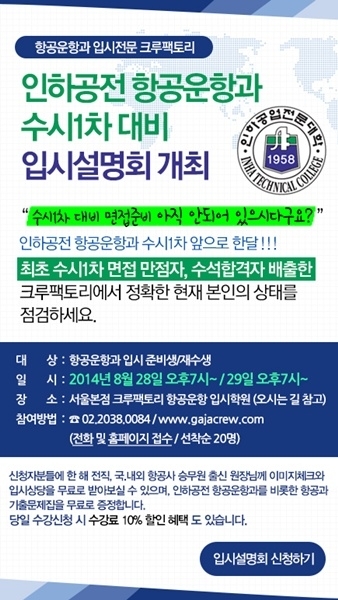 항공운항과 입시전문 크루팩토리에서는 인하공전 항공운항과 수시1차 대비 입시설명회 개최를 내달 28-29일 실시한다. 이번 입시설명회에서는 학부모님들이 참관하는 모의면접 시간을 통해 현재 본인 진단을 할 수 있는 좋은 기회이다.