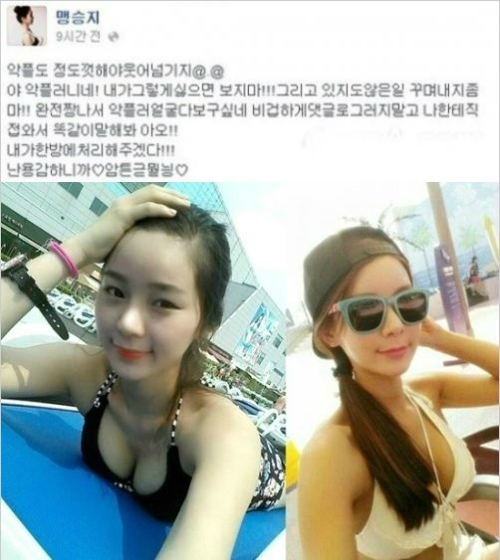 한편, 맹승지는 지난 6월엔 페이스북을 통해 자신의 '로드FC 15' 로드걸 데부에 대해 악성 댓글을 다는 누리꾼들에게 "비겁하게 댓글로 그러지 말고 나한테 직접 와서 똑같이 말해 봐 아오! 내가 한 방에 처리해 주겠다! 난 용감하니까"라고 경고했다.