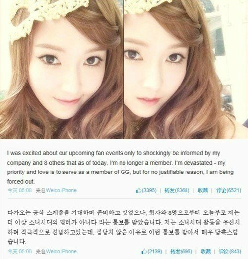 그러면서 “열정과 애정을 쏟으며 그 동안 15년 이상 함께한 동료 멤버들과 회사측에서 내가 사업을 한다는 이유로 소녀시대에서 나가달라는 요구에 너무나 크게 상처를 받았고 안타까운 심경을 감출 수 없다”고 호소했다.