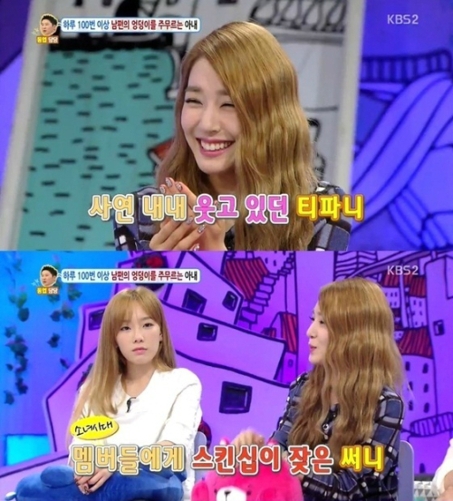 걸그룹 소녀시대 유닛 태티서의 티파니는 지난 6일 밤 11시10분 방송된 KBS2 '대국민 토크쇼 안녕하세요'(이하 안녕하세요)에서 엉덩이를 너무 만지는 아내 때문에 고민이라는 남편이 등장하자 웃음을 터뜨렸다.