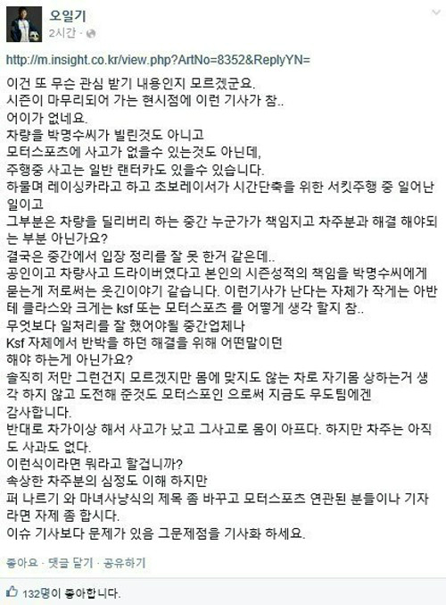 오일기는 지난달 31일 자신의 페이스북을 통해 박명수 관련 비난 글에 대해 "이건 또 무슨 관심받기 내용인지 모르겠군요. 시즌이 마무리되어 가는 현시점에 이런 기사가 참. 어이가 없네요"라며 말문을 열었다.