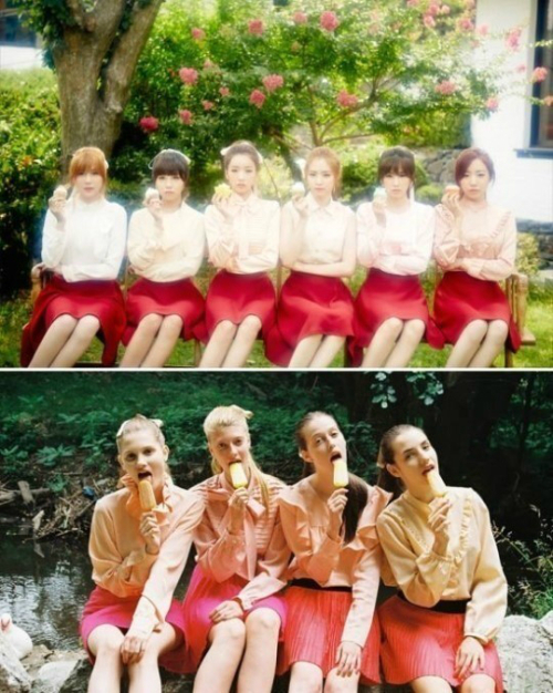 제시한 푸델카의 작품 속에는 네 명의 여성이 나란히 앉아 같은 포즈로 아이스크림을 먹고 있다. 소녀들의 의상도 분홍색 블라우스와 빨간색 치마로 에이핑크의 의상과 비슷하다. 포니테일 머리스타일에 리본을 묶은 점도 에이핑크의 모습과 비슷해 표절시비 논란이 일고 있다.