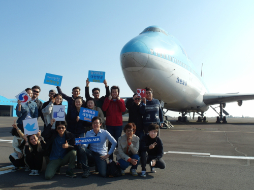 초청된 대한항공 SNS회원들이 정석비행장 앞에서 기념촬영하고 있다.