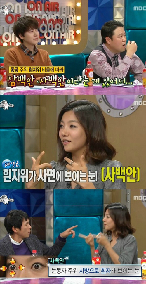 이채영은 "동공 주위 흰자위 비율에 따라 삼백안 사백안이라는 것이 있다" "내가 눈을 크게 뜨면 흰자위 한가운데 검은 눈동자가 있어서 보는 사람들이 다들 무섭다고 하더라"며 눈을 크게 뜨며 설명해 웃음을 자아냈다.