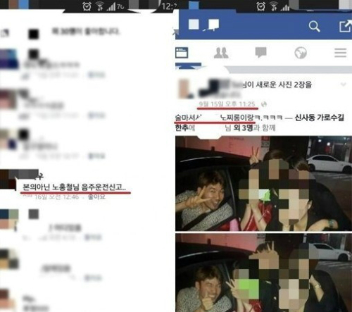 하지만 문제는 기념사진을 올린 팬의 사진 설명이다. 페이스북을 캡처한 이가 일부 내용을 가린 탓에 원문이 모두 드러나지 않았지만, 노홍철이 술을 마셨다는 정황이 담겨 있다. 더욱이 댓글에는 ‘본의 아닌 노홍철님 음주운전 신고’라고 적혀 있어 보는 이들의 이목을 집중시켰다.