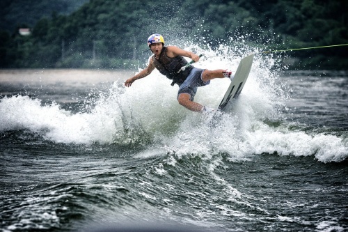 윤상현이 웨이크보드 경기에 출전해 라이딩을 하는 장면.