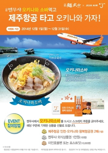 멘무샤에서는 오키나와소바 주문 고객을 대상으로 스크래치 쿠폰을 증정하는데 쿠폰을 긁었을 때, 기재돼 있는 상품을 전달하고 있다. 상품은 1등 제주항공 인천-오키나와 왕복 항공권 2매(1명), 2등 멘무샤 외식상품권 1만원(100명), 3등 제주항공 기념품(1만명)이다.