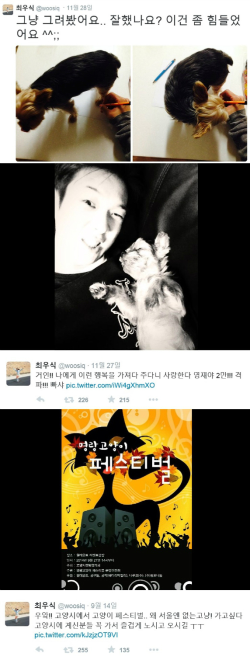 또한 최우식은 "우앜!! 고양시에서 고양이 페스티벌.. 왜 서울엔 없는고냥! 가고싶다 고양시에 계신분들 꼭 가서 즐겁게 노시고 오시길 ㅜㅜ"이란 글과 함께 명랑 고양이 페스티벌을 홍보했다. 명랑 고양이 페스티벌이란 길고양이 중성화를 위해 고양시가 준비한 행사다. 장나라, 페이퍼 플레인, 아웃포스트가 출연했다.