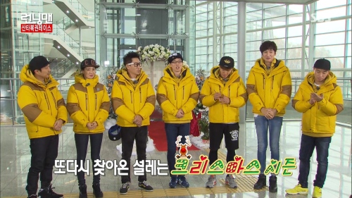 이날 런닝맨에는 김혜자, 강혜정, 이천희가 출연해 크리스마스 특집 ‘국민 엄마를 부탁해’ 편으로 꾸며졌다. 특히 ‘국민 엄마’ 김혜자는 데뷔 50년 만에 최초로 야외 예능에 출연해 몸을 쓰는 미션에도 당황하지 않고 종횡무진 뛰어다니며 열정적으로 레이스에 임했다. 김혜자를 제외하고 노란색 패딩을 입고 나타난 런닝맨 멤버들은 다양한 미션을 수행하며 ‘산타 복권 레이스’를 펼쳤다. 이날 멤버들이 입은 노란색 패딩은 엠리밋의 ‘엘 몽블랑 다운’으로 알려졌다.