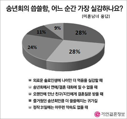 ‘외로운 솔로인생에 나이만 더 먹음을 실감할 때’와 ‘송년회에서 연애/결혼 대화에 낄 수 없을 때’가 각각 28%로 공동 1위를 차지했다.