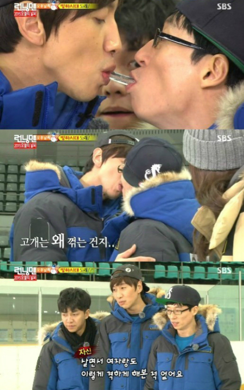이날 게스트로는 이승기, 문채원이 출연한 가운데 ‘런닝맨’ 출연진들은 두 번째 미션인 빙하시대에서 얼음막대과자 게임에 나섰다. 이승기의 앞니가 약해 유재석과 이광수가 나섰다. 두 사람은 고개를 꺾어가며 미션에 몰입했고, 이를 접한 멤버들은 분노와 짜증을 보여 웃음을 자아냈다. 이광수는 “여자랑도 이렇게 격하게 해본 적은 없다”고 말해 실소를 자아냈다.