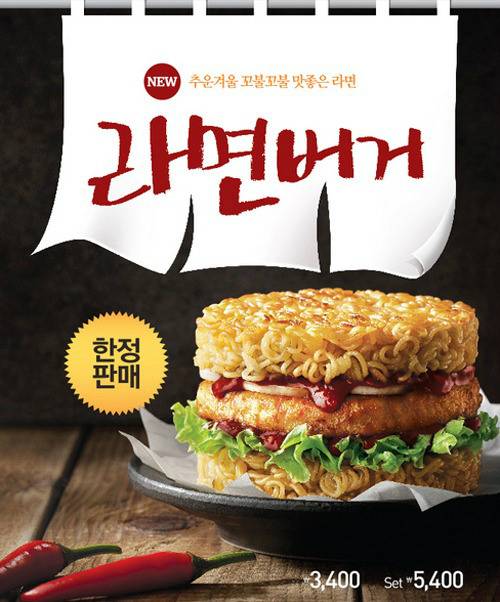 삶은 라면을 구워 부드러운 식감을 강조한 제품으로 빵 대신 라면 면발이 들어가 있으며 고기 패티와 양상추, 할라피뇨 소스 등이 토핑돼있다. 직접 먹어 본 누리꾼의 후기에 따르면 소스는 비빔면 맛이 난다고 전해졌다.
