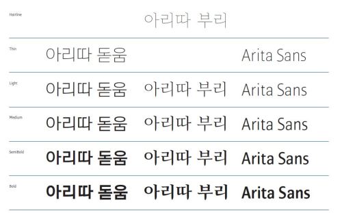 ㈜아모레퍼시픽은 20일 기업의 이미지를 담은 글꼴 ‘아리따’(사진)의 새로운 라인인 ‘아리따 부리’를 무료 배포한다고 밝혔다. 이 서체는 ㈜아모레퍼시픽이 추구하는 단아하고 지적인 멋이 풍기는 현대적인 여성의 아름다움을 담아낸 글꼴로, 2005년에 개발된 ‘아리따 돋움’과 닮은 남매 글꼴이자 긴 호흡의 문장에 적합한 본문용 글꼴이다. ㈜아모레퍼시픽은 아리따 부리 개발을 위하여 기존의 아리따 돋움 디자인을 총괄했던 디자이너 안상수 및 안그라픽스 타이포그라피연구소, 글꼴 디자이너 류양희 등과 협업했으며, 2012년부터 2년 간에 걸쳐 총 5종(Hairline, Light, Medium, Semi-bold, Bold)을 완성했다. 이 중 Hairline(가장 가늘게 표현한 서체)은 국내 최초로 머리카락과 같이 가늘고 섬세한 획 굵기로 설계된 것이 특징으로, 이를 통해 서체의 범위를 확장시키고 쓰임의 폭을 넓혔다.