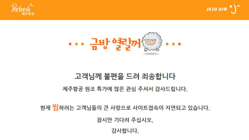 20일 오후 11시 39분께 제주항공 홈페이지는 여전히 접속할 수 없다는 메시지인 “금방 열릴꺼양”이 뜨고 있다.