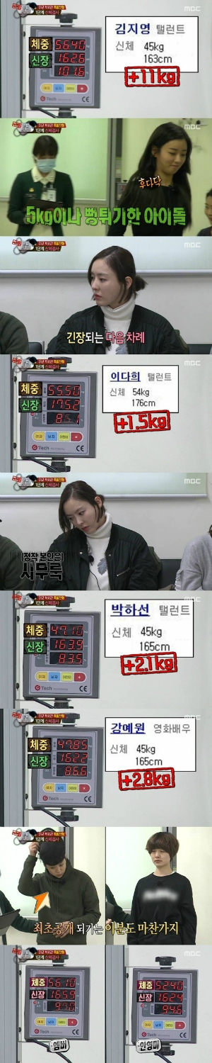 측정 결과 김지영은 162 cm에 56 kg로 프로필상 몸무게와 11 kg이 차이났다. 에이핑크 윤보미는 163 cm에 50 kg 였으며 이다희는 176 cm에 55 kg이었다.