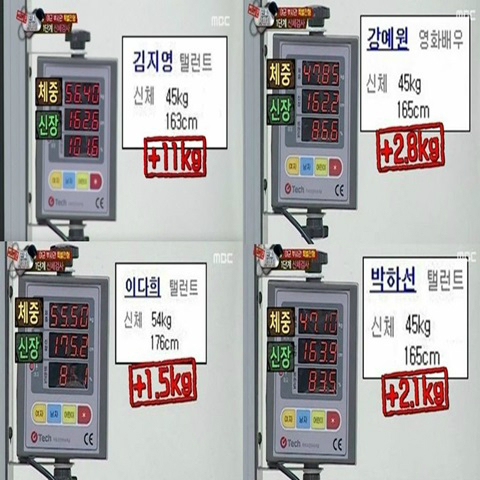 이밖에도 에이핑크 윤보미는 163cm에 50kg, 방송인 이지애는 163cm에 51kg, 에프엑스 엠버는 165cm에 56kg으로 이들 모두 속시원히 자신의 신장과 몸무게를 공개했다.