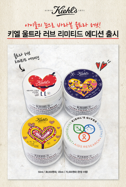 키엘은 기업의 이윤은 반드시 사회에 환원한다는 기업 철학을 지키기 위한 다양한 노력을 1세기 이상 지속해오고 있다. 2006년 출시 이래 대한민국 NO.1* 수분 크림으로 자리매김한 울트라 훼이셜 크림에 대한 고객들의 사랑에 대해 감사의 마음을 전하고, 1세기 넘게 이어온 키엘의 철학을 지켜 나가고자 2015년 ‘키엘 울트라 러브 캠페인’을 진행한다. 이를 위해 한정판 ‘울트라 러브 리미티드 에디션’ 3종을 선보였다.