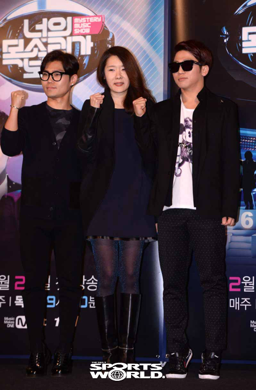 [스포츠월드 김두홍 기자] 가수 김범수, 이선영 감독, 개그맨 유세윤(왼쪽부터)이 24일 여의도 CGV에서 열린 Mnet '너의 목소리가 보여' 제작발표회에서 포즈를 취하고 있다.