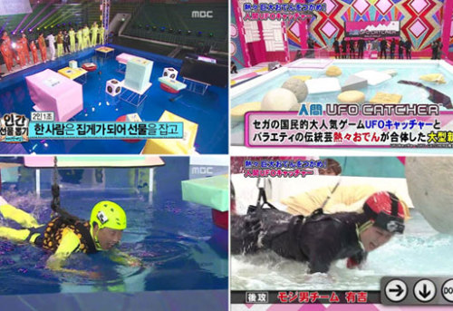 ‘무한도전’은 ‘인간 선물뽑기’란 이름을 사용했고, 일본 프로그램의 제목은 ‘人間 UFO CATCHER’으로 제목까지 흡사했다. 게임 방식, 게임 환경도 놀라울 정도로 흡사하다. 실제 ‘선물뽑기’ 기계에서 영감을 얻었다면, 게임장에 ‘물’은 필요가 없는 상황. 하지만 ‘무한도전-인간 선물뽑기’엔 물이 등장했다. 그리고 그 위에 아이템을 띄워 놓았다. 일본 버라이어티처럼 집게 역할을 맡은 출연자들이 물에 빠지고, 담궈 지는 장면들도 놀라울 정도로 똑같았다. 심지어 조잡스러운 화면 구성까지 비슷해 김태호PD가 일본 방송을 참조하지 않았다고 보기는 힘들다,