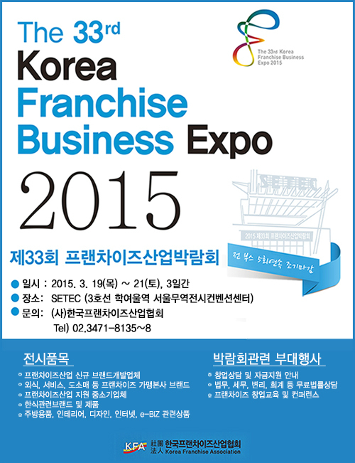 한편 ‘2015 제33회 프랜차이즈산업박람회’는 오는 19일부터 21일까지 사흘간, 학여울역 SETEC에서 개최된다. 150여개 업체의 200여 브랜드의 참여 외에도 창업상담 및 자금지원 안내, 법무. 세무. 변리. 회계 등 무료법률상담, 프랜차이즈창업 교육 및 컨퍼런스 등 다양한 부대행사를 마련한다.