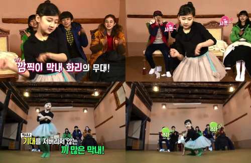 6일 방송되는 ‘막이래쇼: 무작정 여행단’에서 홍화리는 걸그룹 AOA의 ‘사뿐사뿐’ 댄스를 선보이며 끼를 발산한다. 대세 귀요미라 불리는 홍화리는 발레복을 연상케 하는 예쁜 의상과 함께 ‘사뿐사뿐’의 포인트 안무인 고양이 댄스를 깜찍한 버전으로 선보일 예정. ‘무작정 여행단’의 막내 홍화리의 귀여운 댄스에 출연자들과 스태프들 모두 한시도 눈을 떼지 못했다는 후문이다.
