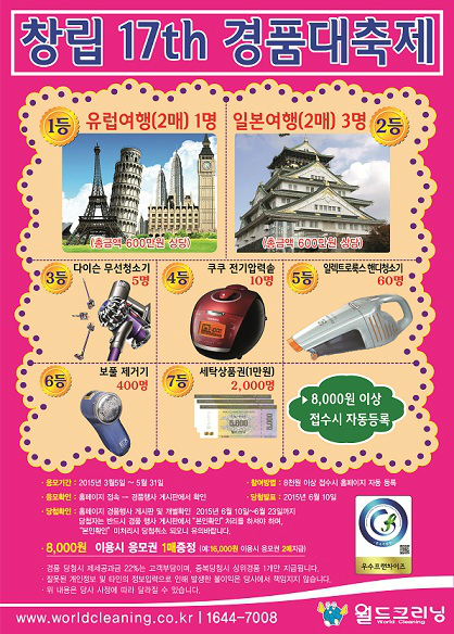 이번 행사는 매년 월드크리닝의 창립을 기념해 진행되는 행사다. 유럽여행 상품권, 일본여행 상품권, 다이슨 무선청소기, 쿠쿠 전기압력밥솥, 일렉트로룩스 핸디청소기, EX 보풀제거기, 세탁상품권 등 당첨자 2479명에 5000만원 상당의 경품을 제공할 예정이다. 본 행사에는 월드크리닝 전국 매장에서 8000원 이상 구매 시 응모권이 증정되며, 홈페이지를 통해 경품 당첨을 확인하는 형식으로 진행된다.