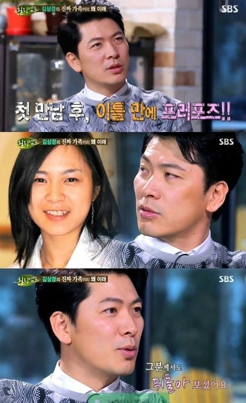 9일 오후 방송된 SBS '힐링캠프'에 출연한 김상경은 "아내를 만나고 다음날 결혼을 하자고 했다는데 사실이냐"는 질문에 "만나고 이틀 만에 청혼했다"고 말문을 열었다.