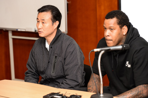 사진=프로농구 LG 제퍼슨(오른쪽)과 김진 감독이 19일 울산롯데호텔에서 애국가 도중 스트레칭을 한 행동에 대한 사과 기자회견을 하고 있다. KBL 제공