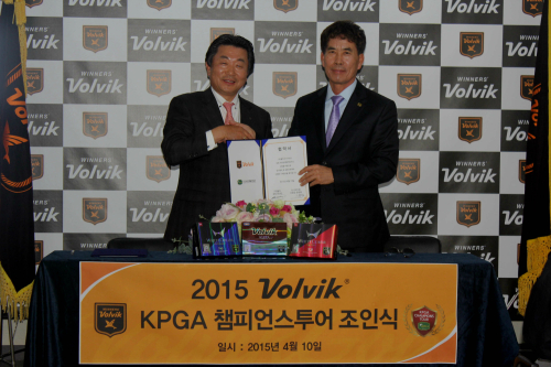 볼빅과 KPGA는 10일 오전 서울 대치동 볼빅 본사에서 ‘2015 볼빅 KPGA 챔피언스투어 제1회 대회’ 조인식을 갖고 한국 골프의 저변 확대와 성공적인 대회 개최를 기원했다. 이날 행사에는 문경안 볼빅 회장과 문춘복 KPGA 시니어지회장 등 대회 관계자들이 참석했다.