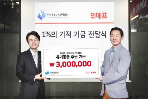 위메프 박유진 기업소통 총괄 디렉터는 “소비자들의 활발한 참여로 유기 동물에 대한 실질적인 도움을 줄 수 있어 기쁘다”며 “앞으로도 다양한 방법을 통해 꾸준히 사회 공헌에 앞장설 예정”이라고 말했다. (사)한국동물구조관리협회는 1998년 설립되어 부상당한 야생동물을 돌보고 서울시와 경기도 일부 지역의 유기동물을 위탁하는 사업을 담당하고 있다, 연간 구조동물은 유기동물이 1만마리, 야생동물이 약 200마리에 이르는 등 한국 최대 규모의 동물구조 협회이다.