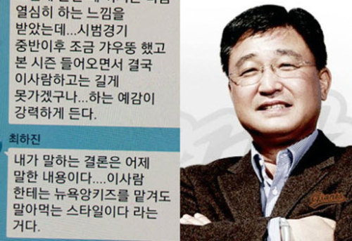 "X톡 보면 다 나온다. 직접도 말했다. 최 전 대표는 김 감독을 불러 번트를 대지말라, 작전이 어떻다고 평가하고 주문했다. 그래서 김 감독이 굉장히 스트레스를 받았다. 성적은 내야하는데. 김 감독은 유한 분이다. 그러니 시즌 중 몇 번이나 그만둔다고 하셨다. 최 전 대표는 일주일마다 감독에게 보고를 하라고도 지시했다. 세상에 어느 감독이 그렇게 보고서를 매주 올리느냐. 말이 되느냐. 그리고 그걸 전달하라는데 내가 어떻게 전달하느냐. 김 감독도 그런 상황을 알고 사표를 내려고 했다."