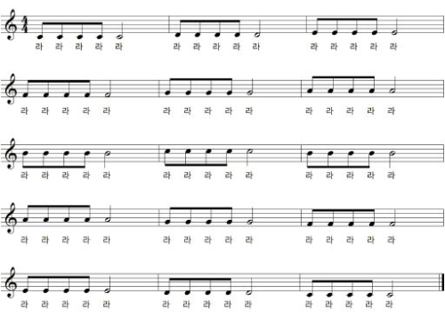 입 모양을 어를 발음할 때처럼하고 <악보1>의 스케일을 자신의 음역에 맞추어 연습한다. 이때 양손을 턱에 대고 턱이 움직이지 않도록 신경을 쓰며, 혀는 매번 발음을 할 때마다 입 안의 바닥으로 편하게 떨어질 수 있게 한다.