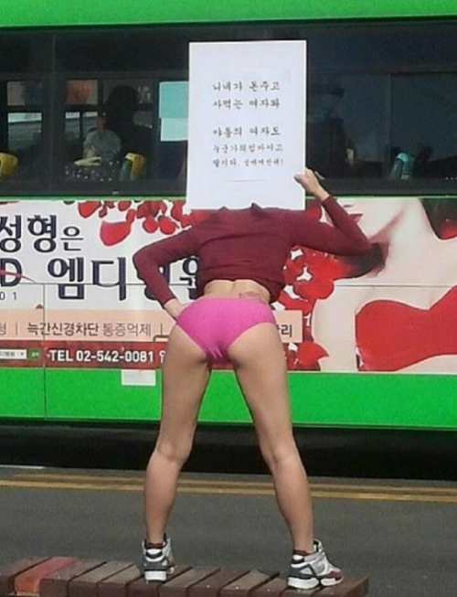 지난 15일부터 복수 온라인 커뮤니티 게시판을 통해 게재된 아우디녀의 사진을 보면 지하철, 청계천, 신촌 등 유동인구가 많은 곳에서 노출 의상을 착용한 채 1인 피켓시위를 하는 장면이 적나라하게 담겨 있다.