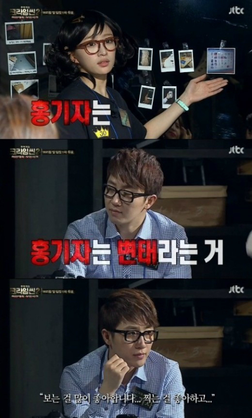 이어 홍기자 역의 홍진호를 손가락으로 지목하며 “다리성애자였다. 변태였다”고 호통을 쳤다. 이에 홍기자는 “취미다. 내가 찍는 걸 좋아하지만 만지는 건 안 좋아한다”며 진땀을 뺐다.