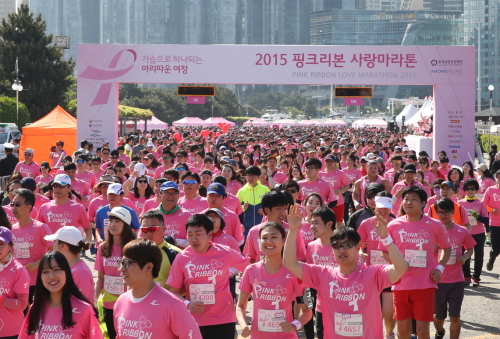 한편, ㈜아모레퍼시픽은 국내 1위 화장품기업으로서 여성 고객에게서 받은 사랑에 보답하고자 지난 2000년 설립기금 전액을 출자하여 국내 최초 유방건강 비영리 공익재단인 한국유방건강재단을 설립하고, 유방건강 의식향상을 위한 핑크리본캠페인을 전개해오고 있다. 국내 최대 핑크리본캠페인 행사인 핑크리본 사랑마라톤은 유방건강 관리를 위한 유용한 정보를 제공할 뿐만 아니라 대회 진행을 통해 참가비 전액 및 아모레퍼시픽의 매칭 기프트, 협찬사 기부금 등을 한국유방건강재단에 기부한다. 이에 2001년부터 지난 해까지 25만 4천여 명의 참가를 통해 총 26억원이 넘는 기부금을 한국유방건강재단에 전달해 왔으며, 그 결과 현재까지 780여 명의 저소득층 유방암 환우의 수술치료비를 지원하고, 700회 이상 대국민 유방건강강좌가 진행될 수 있도록 후원하는 등 건강한 나눔문화의 확산에 기여해 왔다. 보다 자세한 내용은 아모레퍼시픽 사회공헌포털(http://makeupyourlife.amorepacific.com)에서 확인할 수 있다.