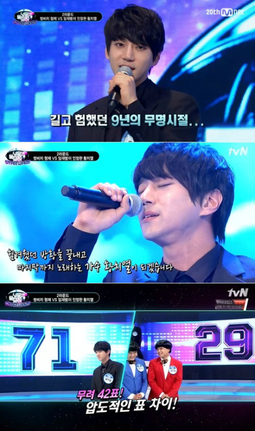 이어 황치열은 임재범의 '비상'을 호소력 짙은 목소리로 열창했다. 결국 황치열은 71대 29라는 점수차로 '쌍비치 형제'를 누르고 승리했다.