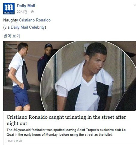 지난 2일 호날두가 프랑스 생트로페 지역에서 노상방뇨를 하다 현지 경찰에 적발됐다는 데일리메일의 보도가 전해지자 익살스러운 댓글이 눈길을 끈다.