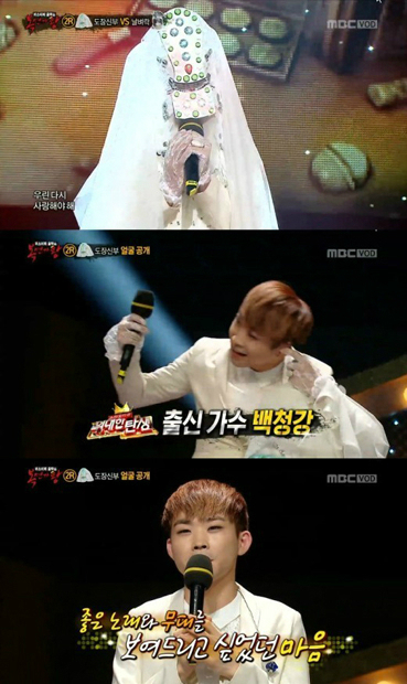 이날 방송에서 가수 왁스의 '화장을 고치고'를 부른 '미스터리 도장신부'는 안타깝게 패해 얼굴을 공개했다. '복면가왕' 판정단들은 '미스터리 도장신부'를 여자로 예상했지만, 가수 백청강임이 밝혀져 촬영장을 충격에 빠뜨렸다.