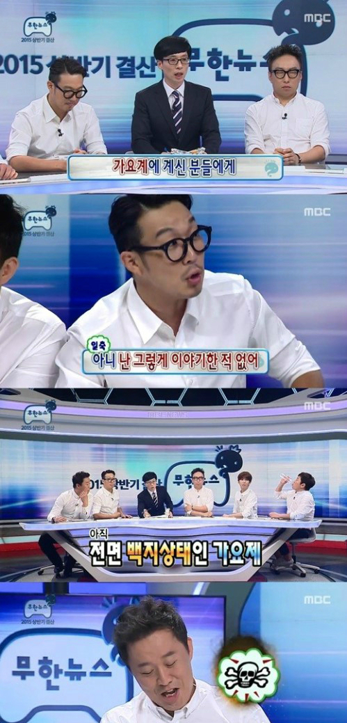 13일 방송된 MBC '무한도전'에서는 유재석, 박명수, 정준하, 정형돈, 하하, 광희가 펼치는 '무한뉴스-2015 상반기 결산' 편이 전파를 탔다.
