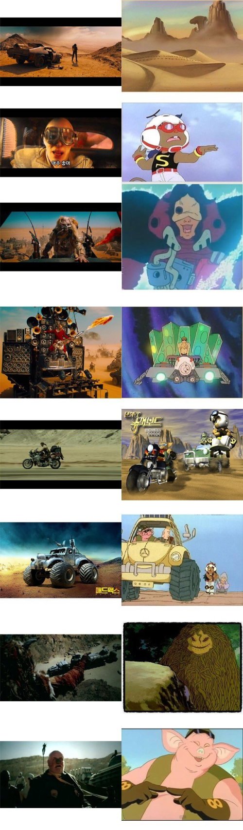 [스포츠월드=김재원 기자] 한 인터넷 커뮤니티에 올라온 ‘매드 맥스 표절의혹’ 게시물이 관심을 끌고 있다. 표절의혹을 받고 있는 원작은 90년대 친구네집 TV앞에 모여들게 한 토종 애니메이션 ‘날아라 슈퍼보드(이하 슈퍼보드)’인 것. 최근 최고의 스크린 화제작으로 승승장구하고 있는 ‘매드맥스: 분노의 도로(이하 매드맥스)’의 씬들과 묘하게 겹치는 부분들이 있다. 일단 두 작품 모두 차를 끌고 정처없이 사막길을 떠난다는 설정이 흡사하다. 임모탄의 모습과 요괴괴물의 모습, 임모탄의 오른팔인 몸짱(?) 파이터 ‘릭투스 에렉투스’와 저팔계의 비교도 적군과 아군의 차이는 있지만 상당히 흥미로운 부분. 특히, ‘매드맥스’에서 전자 기타리스트와 ‘슈퍼보드’의 전자키보드를 연주하는 캐릭터의 비교는 네티즌들에게 공감을 사고 있는 부분이다.